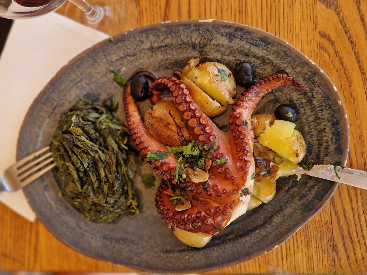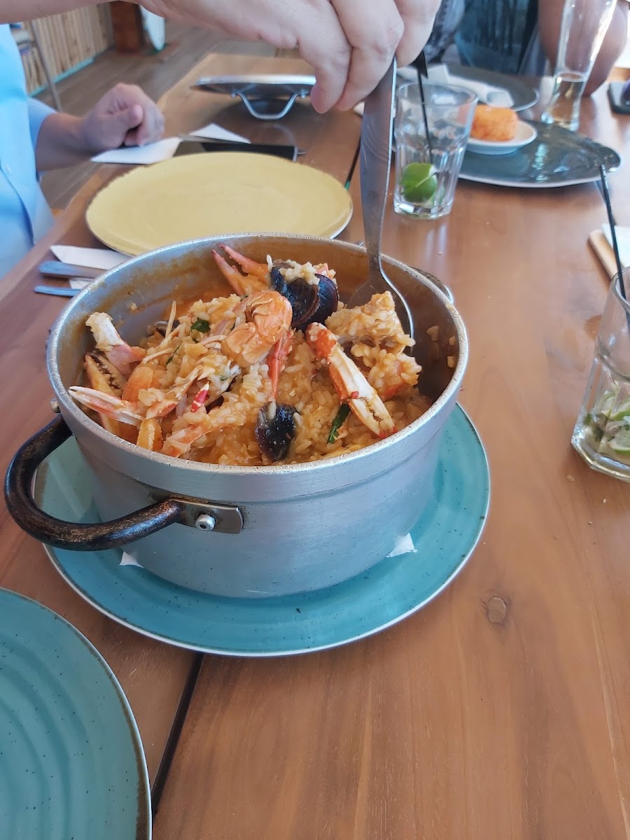 I don’t really understand why there are so many negative reviews about the service — our experience was excellent. Everything arrived very quickly, even though there was an event taking place in the restaurant at the time. We ordered the large octopus rice, and despite being three people, we couldn’t even finish half of it. The octopus salad was also delicious, and the bread with butter, olives, and patê was a perfect start. The passion fruit sangria was quite sweet, but overall we really enjoyed our meal.